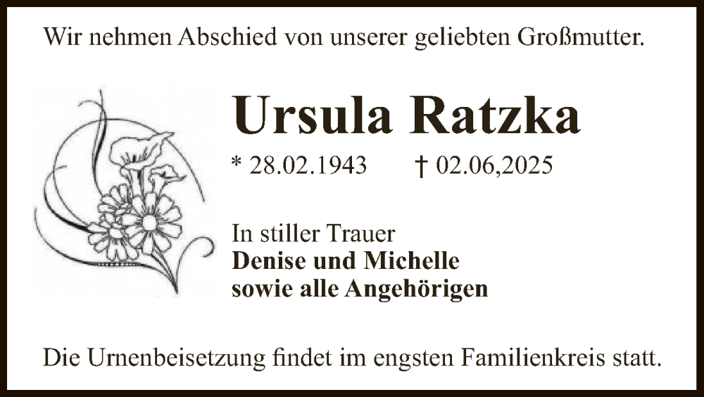 Hier finden Sie alle Traueranzeigen aus der Zeitung, die bisher für Ursula Ratzka erschienen sind. Weitere Traueranzeigen, die in der Zeitung erscheinen, werden hier ebenfalls aufgelistet
