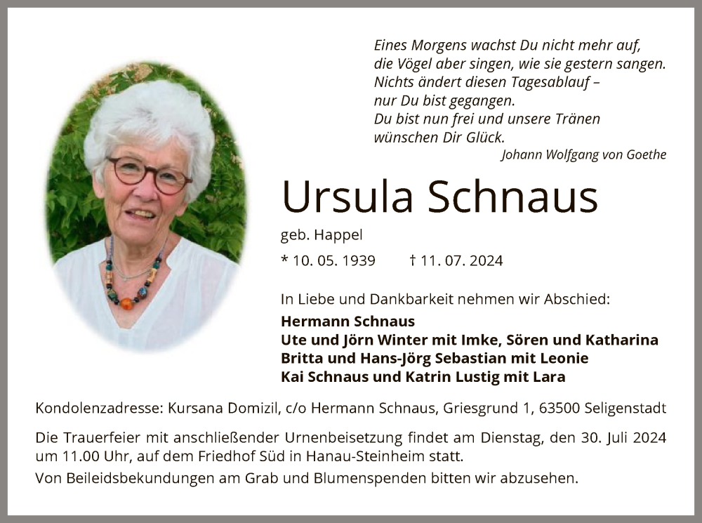Hier finden Sie alle Traueranzeigen aus der Zeitung, die bisher für Ursula Schnaus erschienen sind. Weitere Traueranzeigen, die in der Zeitung erscheinen, werden hier ebenfalls aufgelistet