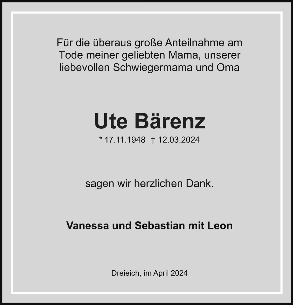 Hier finden Sie alle Traueranzeigen aus der Zeitung, die bisher für Ute Bärenz erschienen sind. Weitere Traueranzeigen, die in der Zeitung erscheinen, werden hier ebenfalls aufgelistet