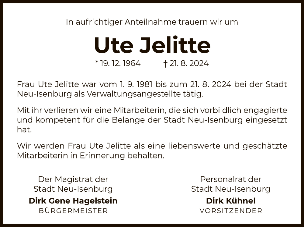 Hier finden Sie alle Traueranzeigen aus der Zeitung, die bisher für Ute Jelitte erschienen sind. Weitere Traueranzeigen, die in der Zeitung erscheinen, werden hier ebenfalls aufgelistet