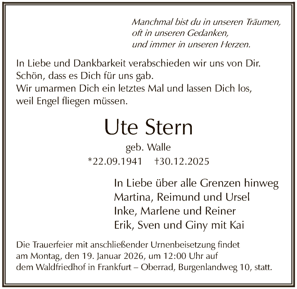 Hier finden Sie alle Traueranzeigen aus der Zeitung, die bisher für Ute Stern erschienen sind. Weitere Traueranzeigen, die in der Zeitung erscheinen, werden hier ebenfalls aufgelistet