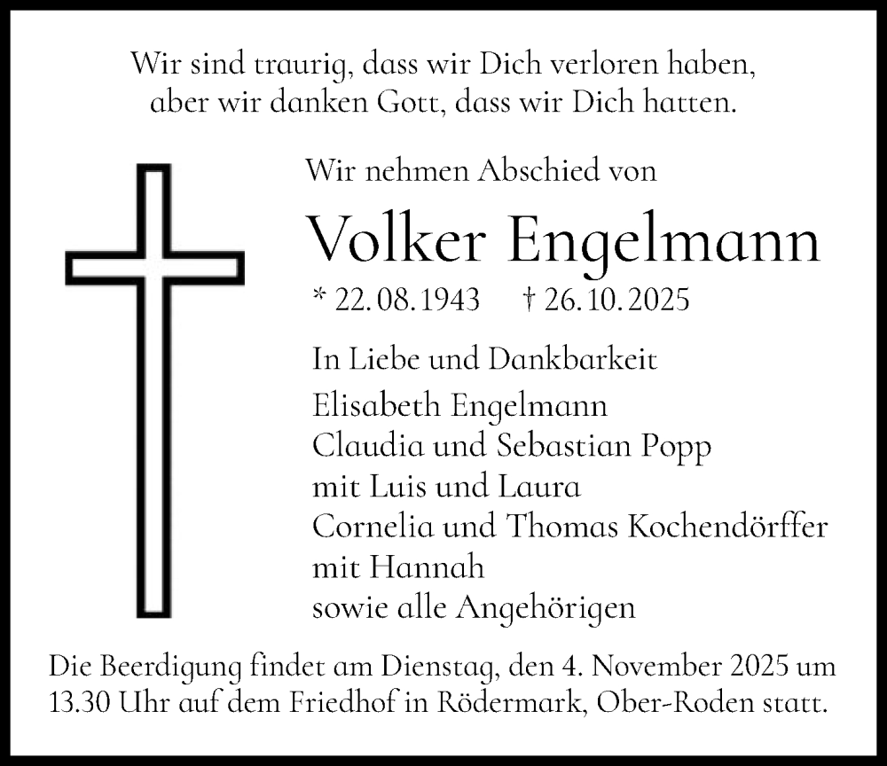 Hier finden Sie alle Traueranzeigen aus der Zeitung, die bisher für Volker Engelmann erschienen sind. Weitere Traueranzeigen, die in der Zeitung erscheinen, werden hier ebenfalls aufgelistet