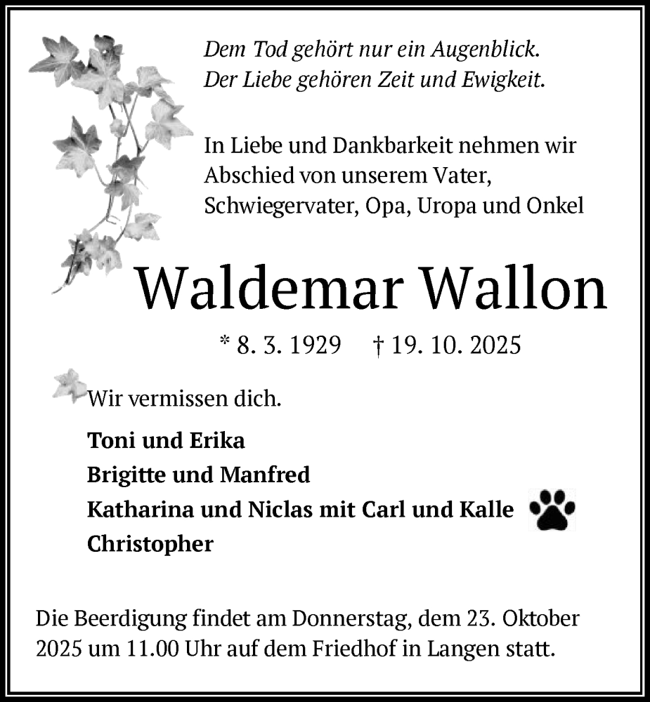 Hier finden Sie alle Traueranzeigen aus der Zeitung, die bisher für Waldemar Wallon erschienen sind. Weitere Traueranzeigen, die in der Zeitung erscheinen, werden hier ebenfalls aufgelistet