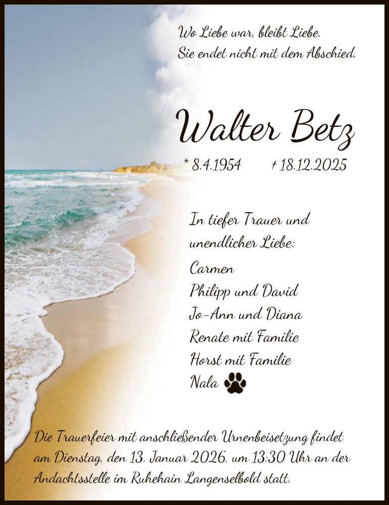 Hier finden Sie alle Traueranzeigen aus der Zeitung, die bisher für Walter Betz erschienen sind. Weitere Traueranzeigen, die in der Zeitung erscheinen, werden hier ebenfalls aufgelistet