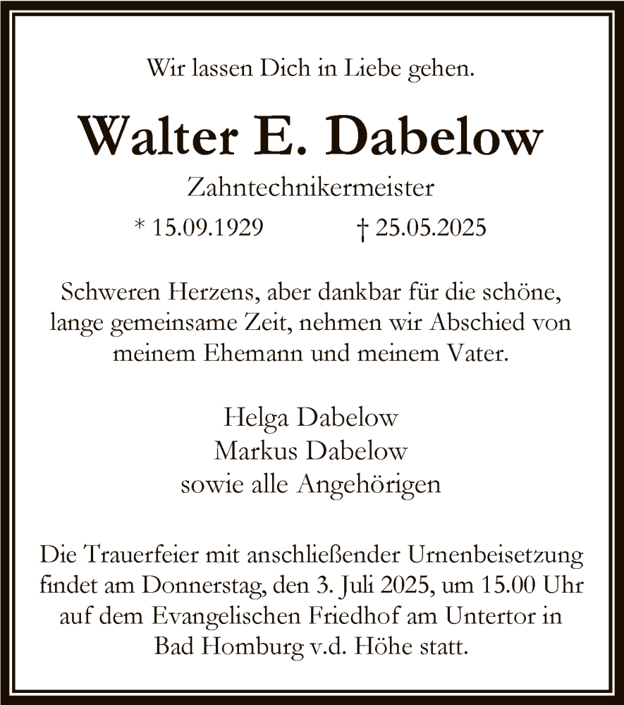 Hier finden Sie alle Traueranzeigen aus der Zeitung, die bisher für Walter Dabelow erschienen sind. Weitere Traueranzeigen, die in der Zeitung erscheinen, werden hier ebenfalls aufgelistet