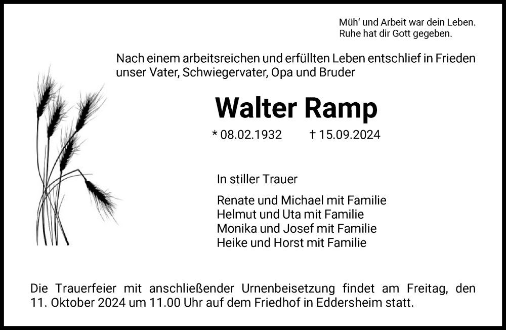 Hier finden Sie alle Traueranzeigen aus der Zeitung, die bisher für Walter Ramp erschienen sind. Weitere Traueranzeigen, die in der Zeitung erscheinen, werden hier ebenfalls aufgelistet