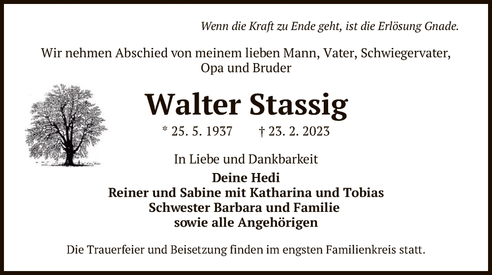 Hier finden Sie alle Traueranzeigen aus der Zeitung, die bisher für Walter Stassig erschienen sind. Weitere Traueranzeigen, die in der Zeitung erscheinen, werden hier ebenfalls aufgelistet
