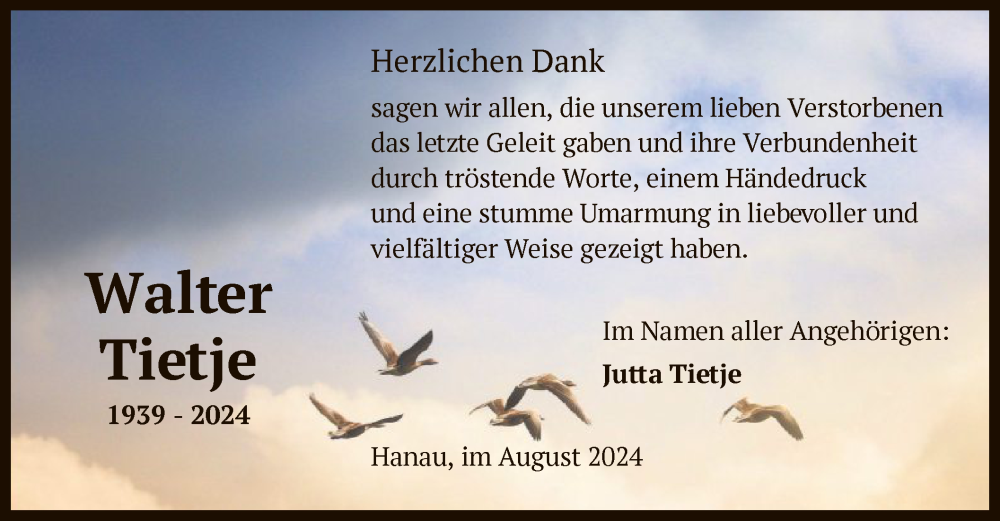 Hier finden Sie alle Traueranzeigen aus der Zeitung, die bisher für Walter Tietje erschienen sind. Weitere Traueranzeigen, die in der Zeitung erscheinen, werden hier ebenfalls aufgelistet