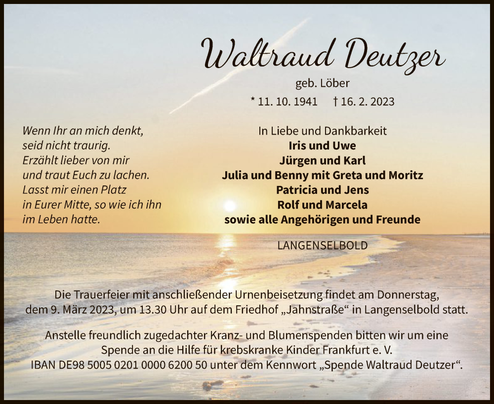 Hier finden Sie alle Traueranzeigen aus der Zeitung, die bisher für Waltraud Deutzer erschienen sind. Weitere Traueranzeigen, die in der Zeitung erscheinen, werden hier ebenfalls aufgelistet