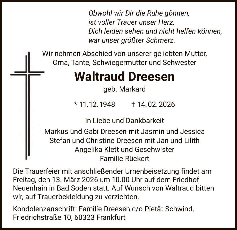 Hier finden Sie alle Traueranzeigen aus der Zeitung, die bisher für Waltraud Dreesen erschienen sind. Weitere Traueranzeigen, die in der Zeitung erscheinen, werden hier ebenfalls aufgelistet