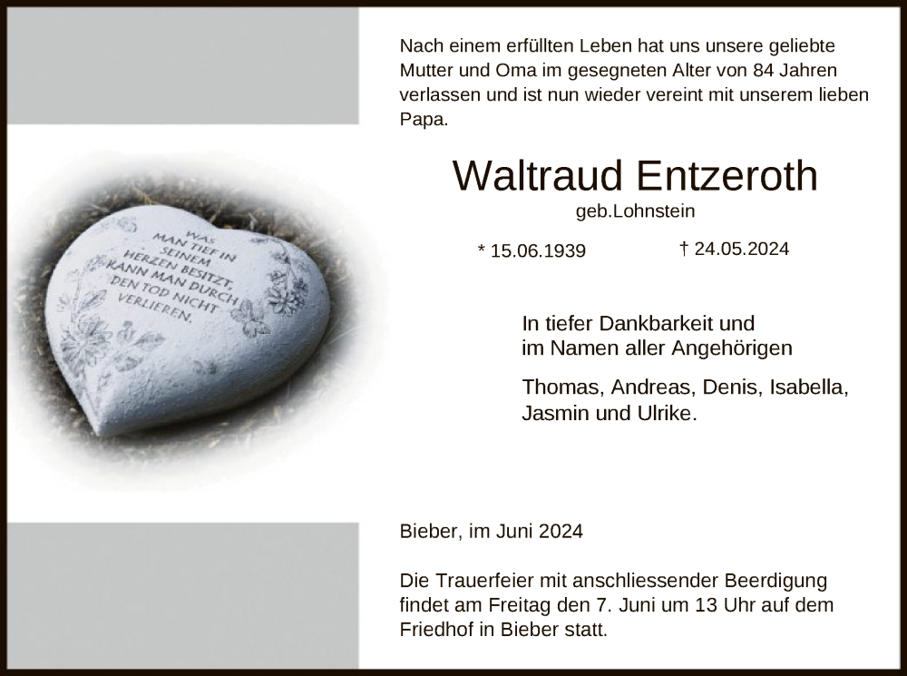 Hier finden Sie alle Traueranzeigen aus der Zeitung, die bisher für Waltraud Entzeroth erschienen sind. Weitere Traueranzeigen, die in der Zeitung erscheinen, werden hier ebenfalls aufgelistet