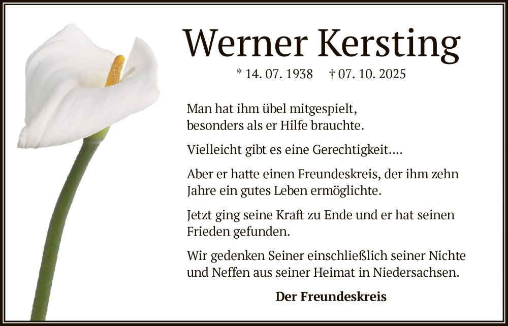 Hier finden Sie alle Traueranzeigen aus der Zeitung, die bisher für Werner Kersting erschienen sind. Weitere Traueranzeigen, die in der Zeitung erscheinen, werden hier ebenfalls aufgelistet