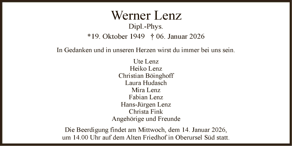 Hier finden Sie alle Traueranzeigen aus der Zeitung, die bisher für Werner Lenz erschienen sind. Weitere Traueranzeigen, die in der Zeitung erscheinen, werden hier ebenfalls aufgelistet