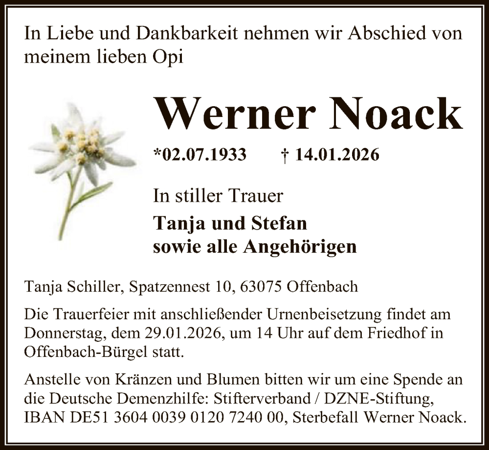 Hier finden Sie alle Traueranzeigen aus der Zeitung, die bisher für Werner Noack erschienen sind. Weitere Traueranzeigen, die in der Zeitung erscheinen, werden hier ebenfalls aufgelistet