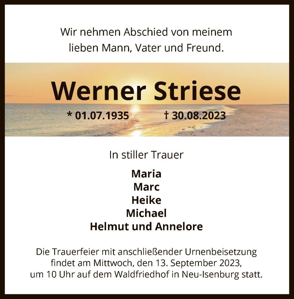 Hier finden Sie alle Traueranzeigen aus der Zeitung, die bisher für Werner Striese erschienen sind. Weitere Traueranzeigen, die in der Zeitung erscheinen, werden hier ebenfalls aufgelistet
