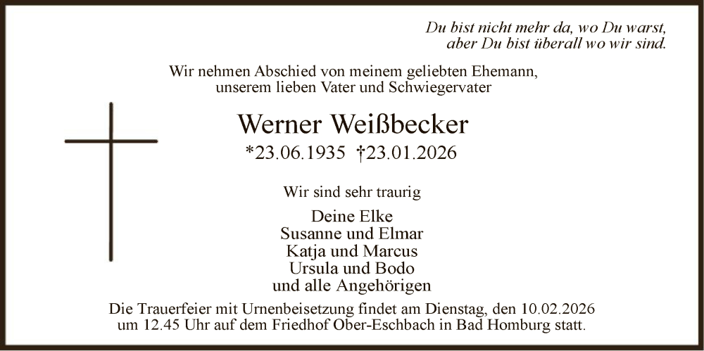 Hier finden Sie alle Traueranzeigen aus der Zeitung, die bisher für Werner Weißbecker erschienen sind. Weitere Traueranzeigen, die in der Zeitung erscheinen, werden hier ebenfalls aufgelistet