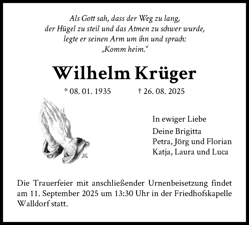 Hier finden Sie alle Traueranzeigen aus der Zeitung, die bisher für Wilhelm Krüger erschienen sind. Weitere Traueranzeigen, die in der Zeitung erscheinen, werden hier ebenfalls aufgelistet