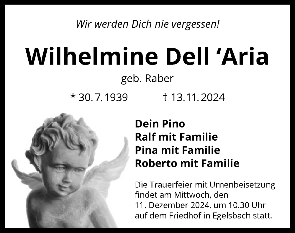 Hier finden Sie alle Traueranzeigen aus der Zeitung, die bisher für Wilhelmine DellAria erschienen sind. Weitere Traueranzeigen, die in der Zeitung erscheinen, werden hier ebenfalls aufgelistet