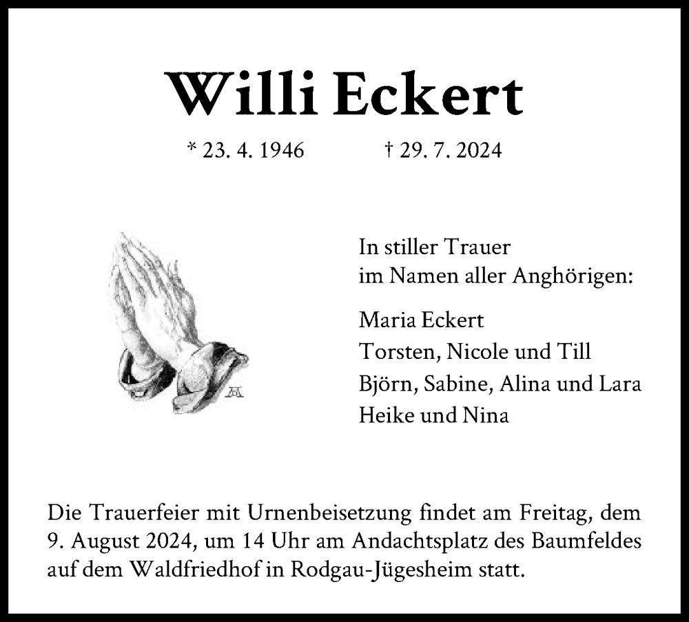 Hier finden Sie alle Traueranzeigen aus der Zeitung, die bisher für Willi Eckert erschienen sind. Weitere Traueranzeigen, die in der Zeitung erscheinen, werden hier ebenfalls aufgelistet