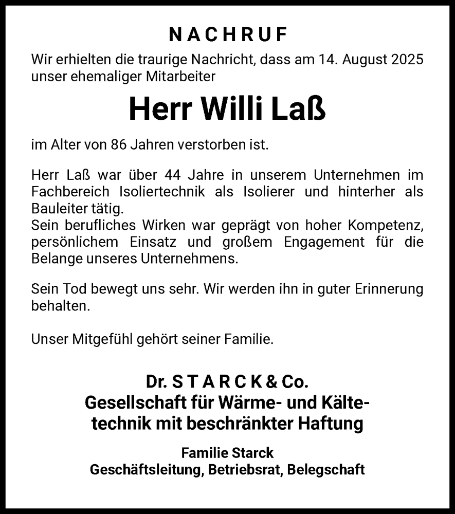 Hier finden Sie alle Traueranzeigen aus der Zeitung, die bisher für Willi Laß erschienen sind. Weitere Traueranzeigen, die in der Zeitung erscheinen, werden hier ebenfalls aufgelistet