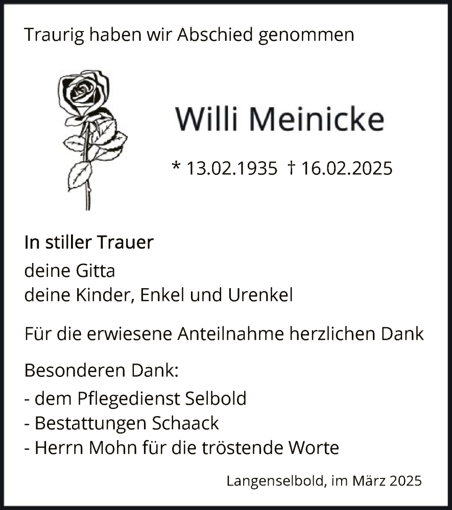Hier finden Sie alle Traueranzeigen aus der Zeitung, die bisher für Willi Meinicke erschienen sind. Weitere Traueranzeigen, die in der Zeitung erscheinen, werden hier ebenfalls aufgelistet