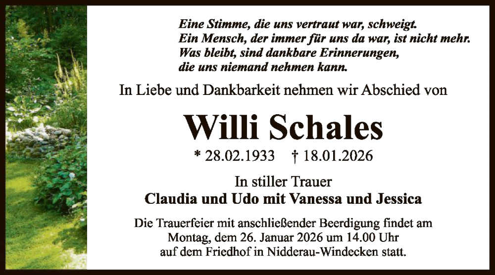 Hier finden Sie alle Traueranzeigen aus der Zeitung, die bisher für Willi Schales erschienen sind. Weitere Traueranzeigen, die in der Zeitung erscheinen, werden hier ebenfalls aufgelistet