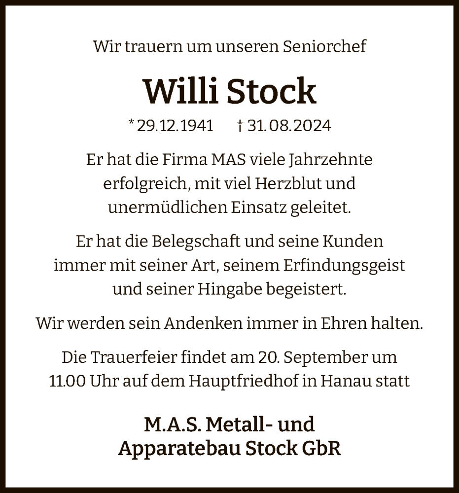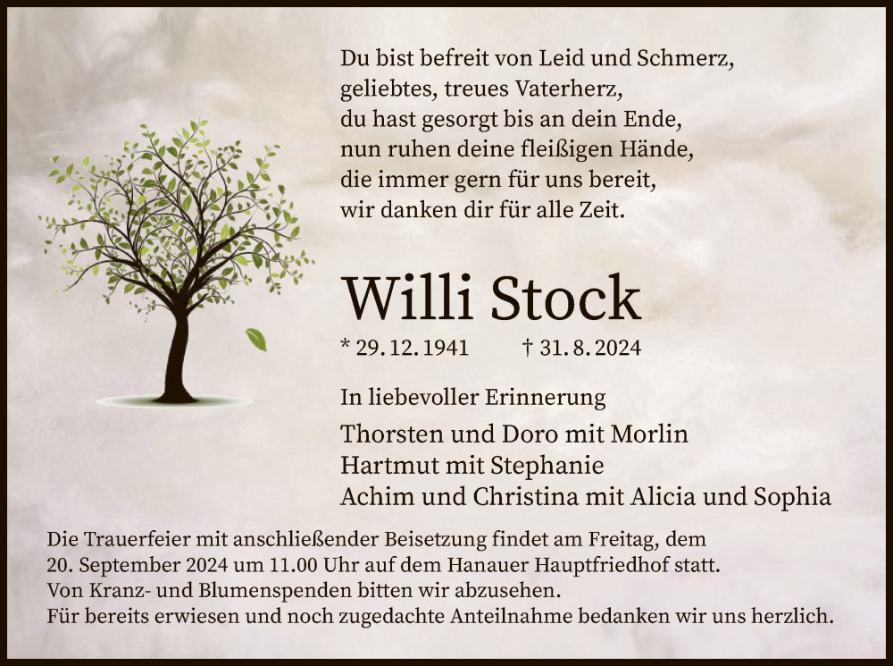 Hier finden Sie alle Traueranzeigen aus der Zeitung, die bisher für Willi Stock erschienen sind. Weitere Traueranzeigen, die in der Zeitung erscheinen, werden hier ebenfalls aufgelistet