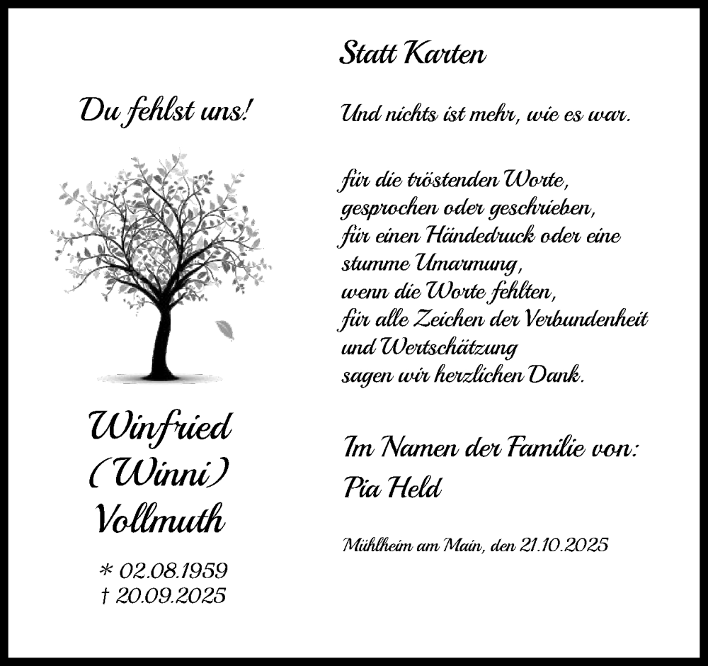 Hier finden Sie alle Traueranzeigen aus der Zeitung, die bisher für Winfried Vollmuth erschienen sind. Weitere Traueranzeigen, die in der Zeitung erscheinen, werden hier ebenfalls aufgelistet