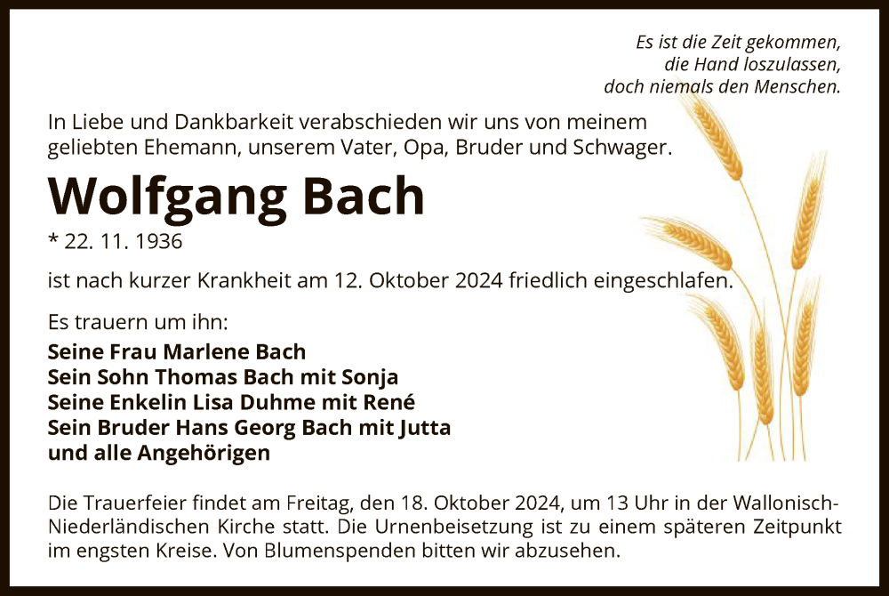 Hier finden Sie alle Traueranzeigen aus der Zeitung, die bisher für Wolfgang Bach erschienen sind. Weitere Traueranzeigen, die in der Zeitung erscheinen, werden hier ebenfalls aufgelistet