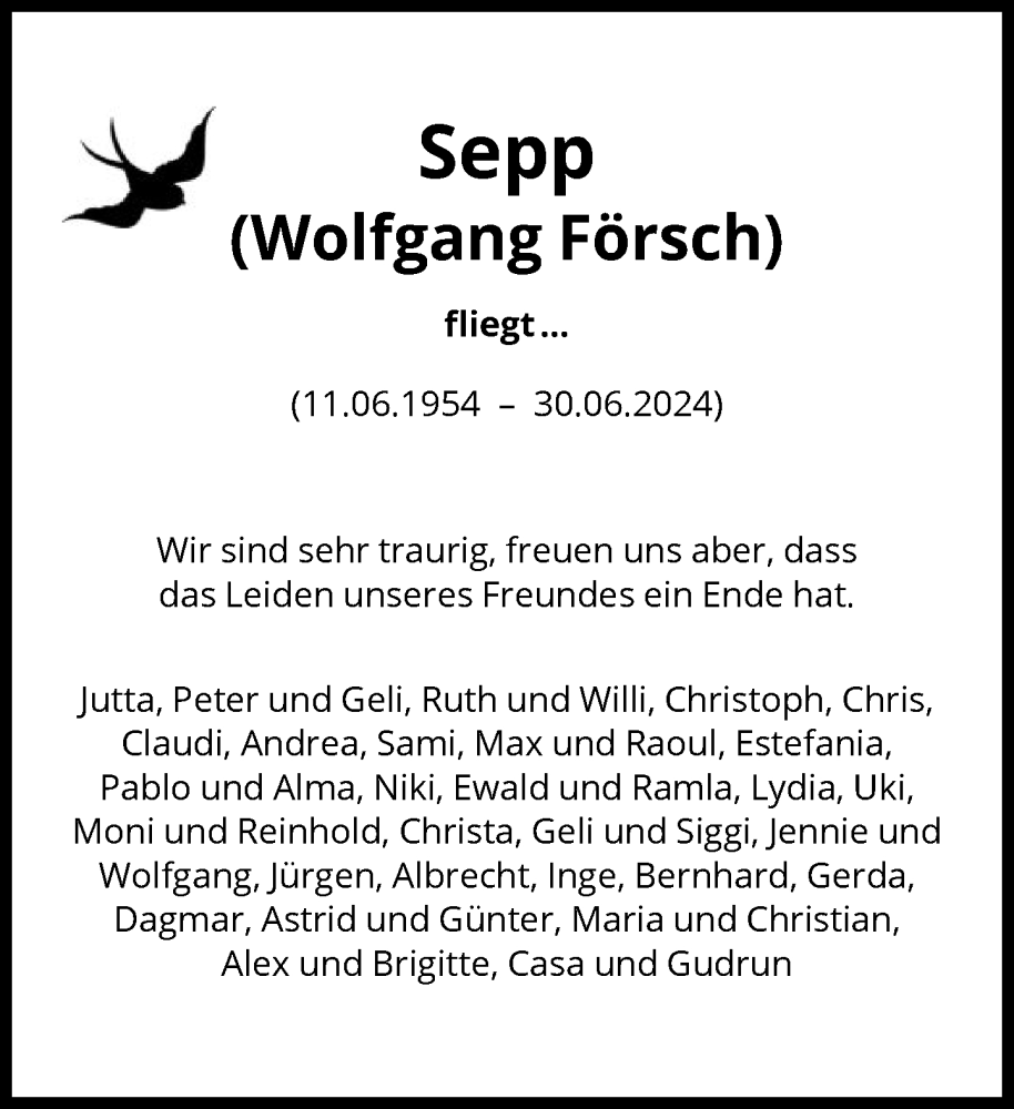 Hier finden Sie alle Traueranzeigen aus der Zeitung, die bisher für Wolfgang Försch erschienen sind. Weitere Traueranzeigen, die in der Zeitung erscheinen, werden hier ebenfalls aufgelistet