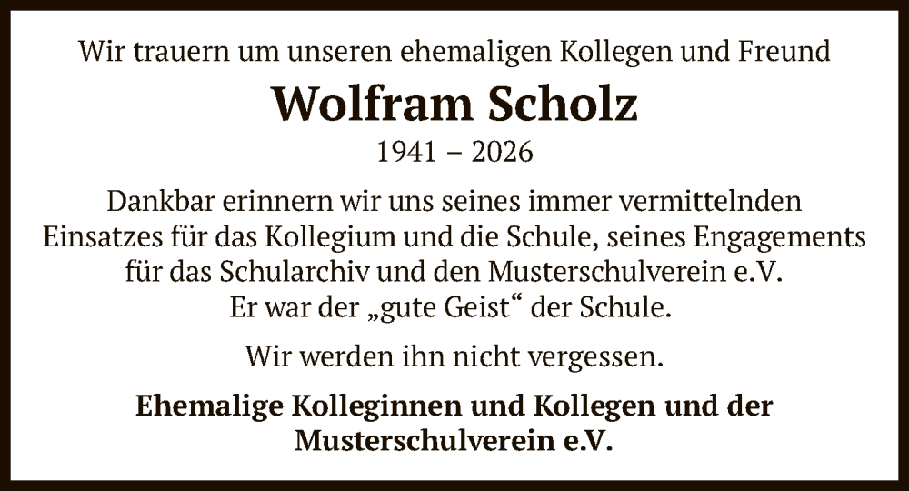Hier finden Sie alle Traueranzeigen aus der Zeitung, die bisher für Wolfram Scholz erschienen sind. Weitere Traueranzeigen, die in der Zeitung erscheinen, werden hier ebenfalls aufgelistet